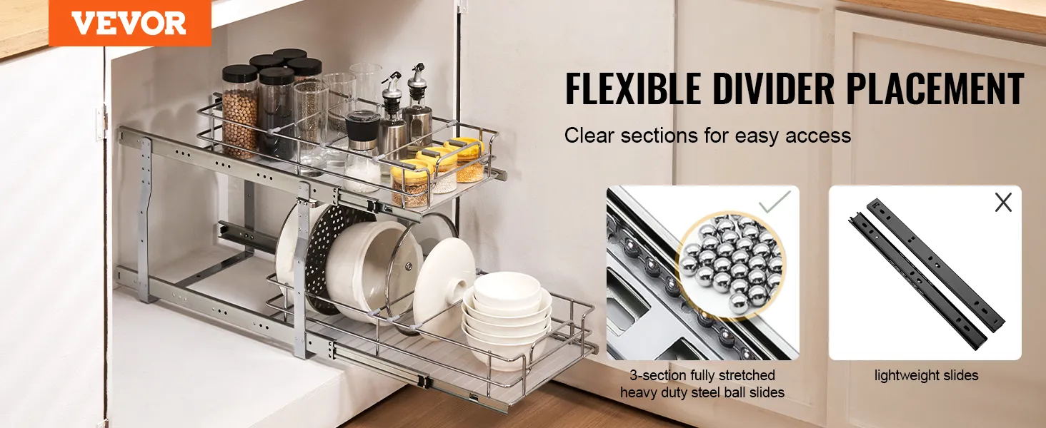 Úspora miesta: Dvojúrovňový výsuvný organizér na skrinky vytvára viac úložného priestoru v skrinkách a umožňuje uloženie predmetov, ako sú panvice, koreničky, konzervy a čistiace prostriedky, čím výrazne šetrí váš úložný priestor.