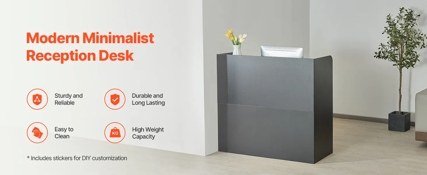 Robustní a spolehlivá konstrukce: Tento recepční pult je vyroben z dřevovláknité desky s vysokou hustotou (MDF) s hladkým, odolným proti opotřebení a voděodolným povrchem, díky čemuž je ideální pro dlouhodobé používání a snadnou údržbu. Pracovní deska a rám jsou konstrukčně stabilní s vysokou nosností, což zaručuje odolnost a dlouhou životnost.