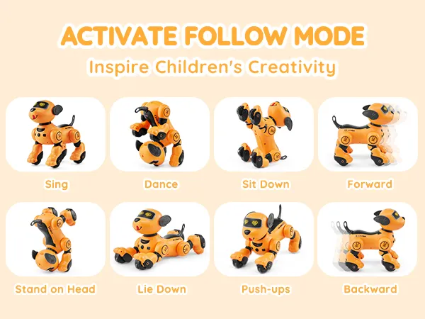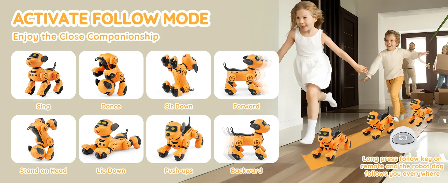 Follow Mode: This RC robot dog toy can follow your child's every step using its advanced sensor. Just press and hold the follow button on the remote, and it will stay close. When you ignore it, it will bark like a real dog or perform some stunts to remind you to play with it, adding extra fun to playtime.