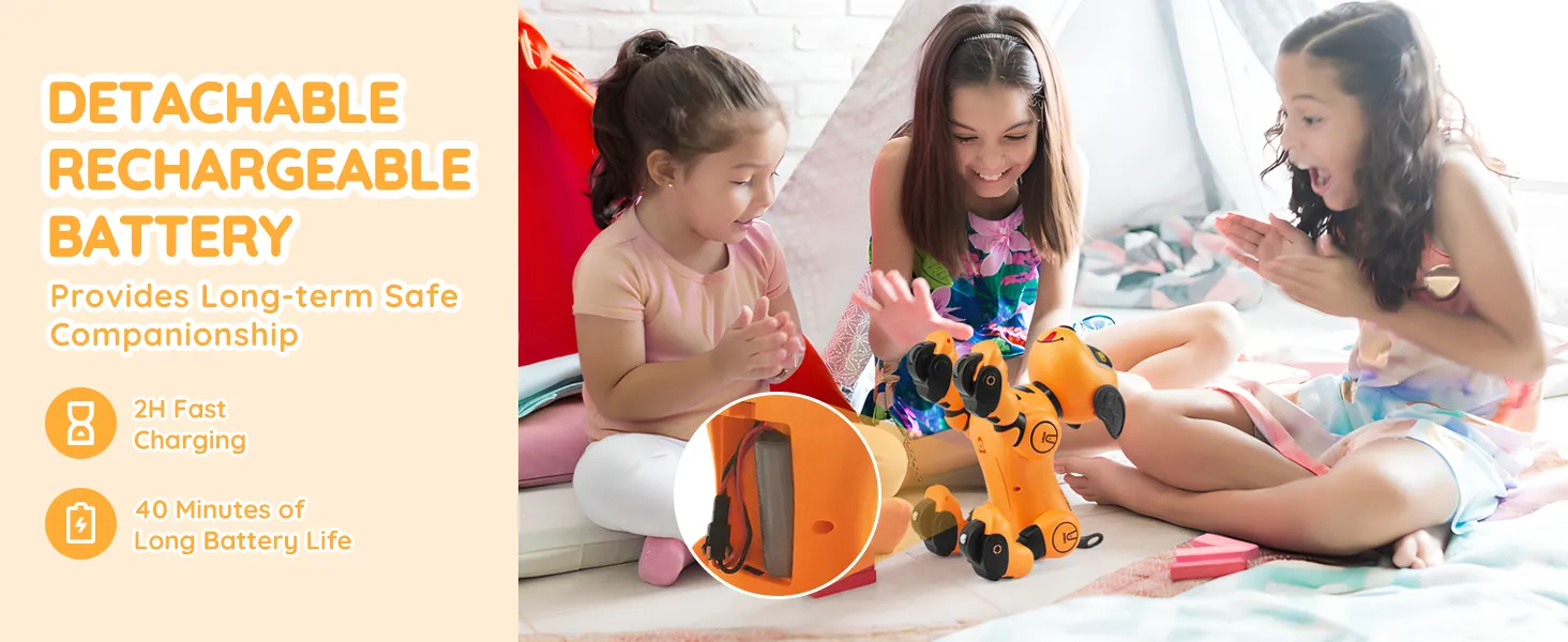 This robot dog isn't just a toy—it's a caring companion. Designed with a removable battery, it eliminates the risks of playing while charging, so kids can enjoy their fun time safely.