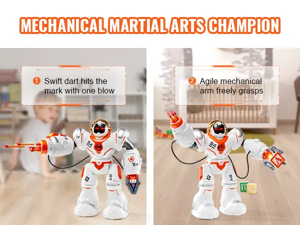 Powerful Mechanical Arm & 3 Battle Modes: With flexible mechanical arms that move up and down and a strong grip for grabbing things, this remote control robot is ready for action. The combo of mechanical arms and 3 battle modes make this robot full of dynamic movements and interactive fun.