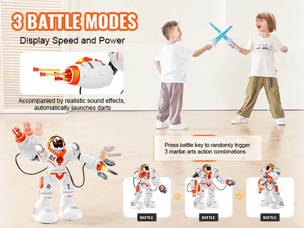 Switch between three exciting battle modes to challenge reflexes and strategy skills. Our RC robot is all about making playtime more thrilling and interactive.