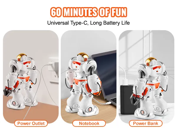 Recharge the robot toy easily with USB. It has a long-lasting battery, ready for fun anytime, whether indoors or outdoors.