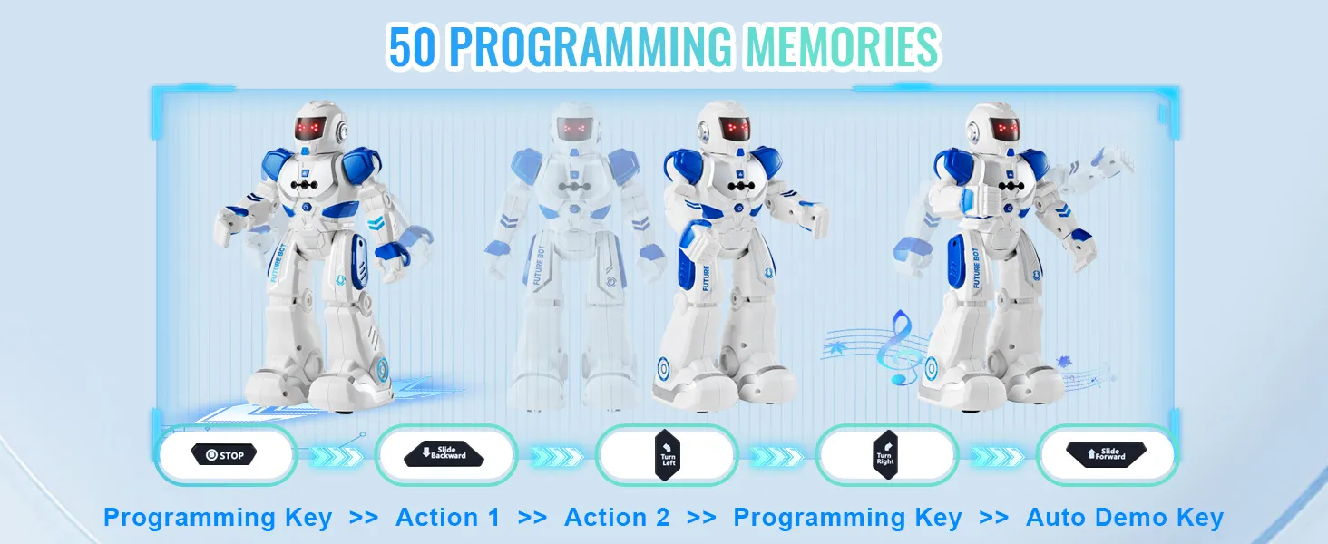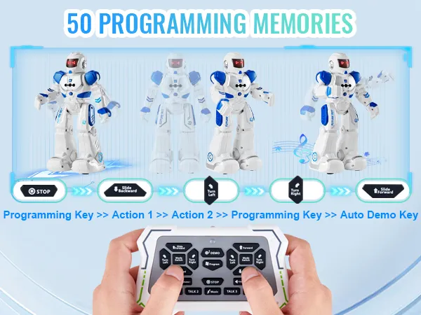 Smart Programming with 50 Moves: Our smart robot toy can perform a sequence of 50 moves you program. When you switch to programming mode, this interactive robot will use its action-recording feature to replay your custom sequence, such as turning left + turning right + walking forward + walking backward + patrolling + dancing + more action modes you select.