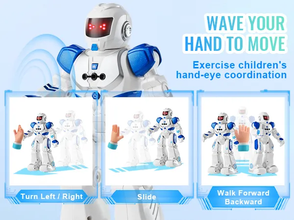 Remote & Gesture Control: Take control with a wave of your hand! This gesture-sensing robot responds to both the infrared controller and your hand gestures, easily turning left and right, sliding backward and forward. It also comes with auto display and obstacle avoidance features. Watch its bright blue LED eyes light up as it moves!
