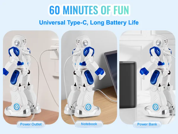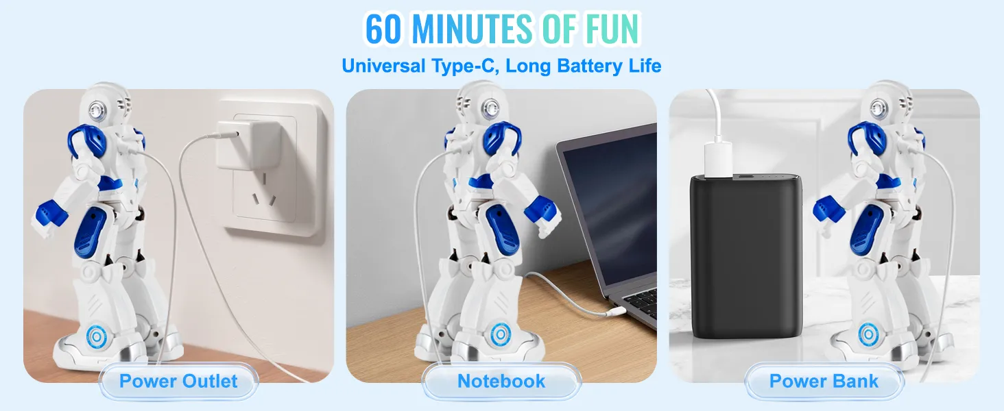 Recharge the robot toy easily with USB. It has a long-lasting battery, ready for fun anytime, whether indoors or outdoors.