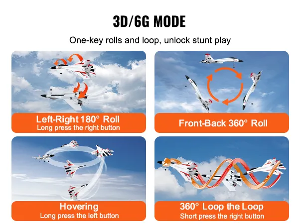 Alsidig akrobatisk sjov: Dette fjernstyrede fly har et 4-kanals design med 3D/6G-tilstande, der giver mulighed for spændende rulninger, flips, loops og inverterede flyvninger. Det er udstyret med en-knaps færdighedskontrol for en fornøjelig flyveoplevelse, der er velegnet til både begyndere og erfarne piloter, der vil mestre perfekte manøvrer og nyde spændende fjernstyrede flyvninger.