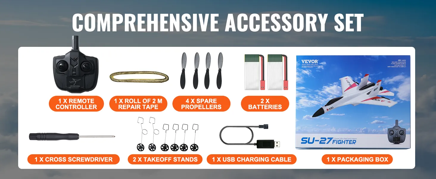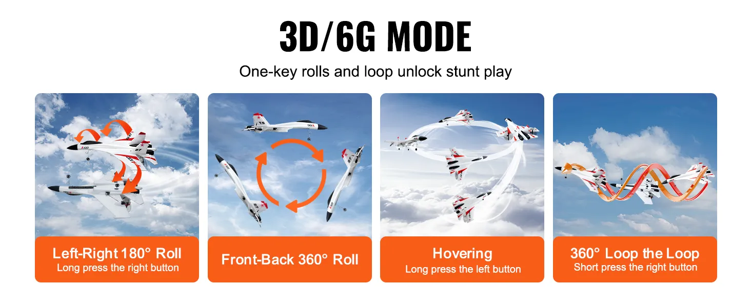 2,4 GHz trådløst styresystem: Ud over grundlæggende flyvekontrol forenkler controlleren akrobatiske stunts som ruller og inverterede flyvninger med betjening med én knap. 2,4 GHz-frekvensen sikrer en pålidelig forbindelse, der gør det muligt for flere fjernstyrede fly at flyve sammen problemfrit – ideelt til venskabelige konkurrencer!