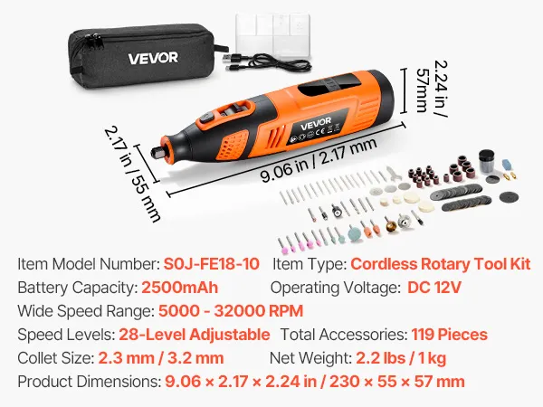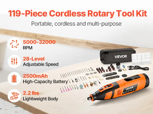The VEVOR 119-piece DC12V cordless rotary tool kit delivers versatile functionality for cutting, sanding, drilling, grinding, carving, engraving, polishing, and cleaning. Featuring 28 adjustable speeds (5000-32000 RPM) and a slim, lightweight design, it is ideal for various DIY creative projects.