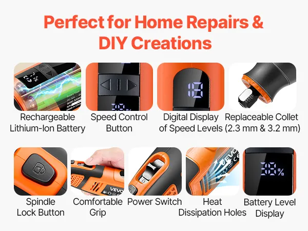 28-Speed Adjustable & Digital Display: VEVOR DC12V cordless rotary tool kit features 28-level adjustable speeds (5000–32000 RPM), allowing you to choose the ideal speed for each task. Digital display of speed levels ensures more precise control, perfect for DIYers, craftsmen, and hobby users