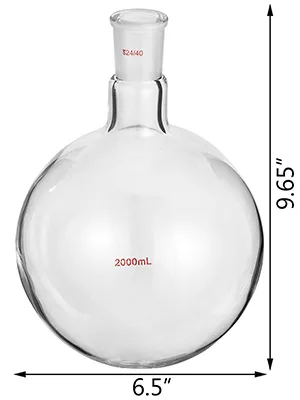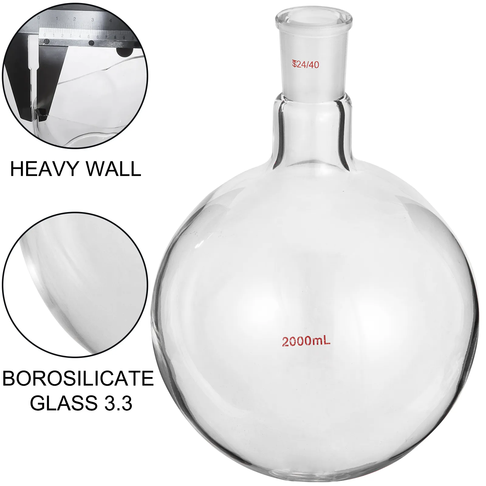 The spherical flask is made of borosilicate glass with a massive wall, featuring high-temperature resistance and a low expansion rate.
