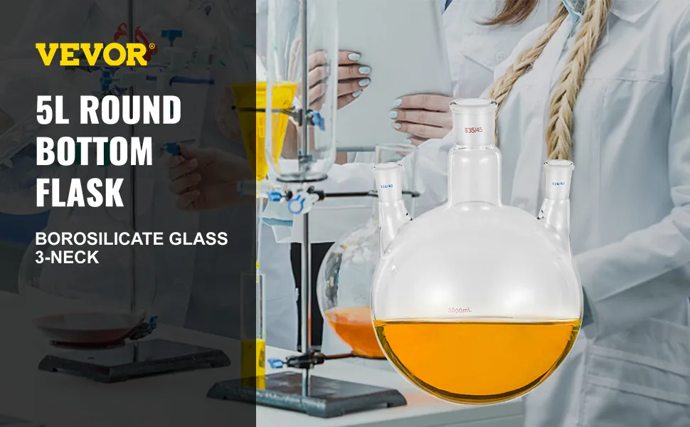 The round bottom flask is made of heat-resistant borosilicate glass with a massive wall, making it sturdy and durable. The flasks around the neck are equipped with 24/40 and 34/45 standard taper joints with the frosted inner surface, which have excellent sealing without any leakage. With stable performance, this cork stand round bottom flask is widely applied in organic chemistry.