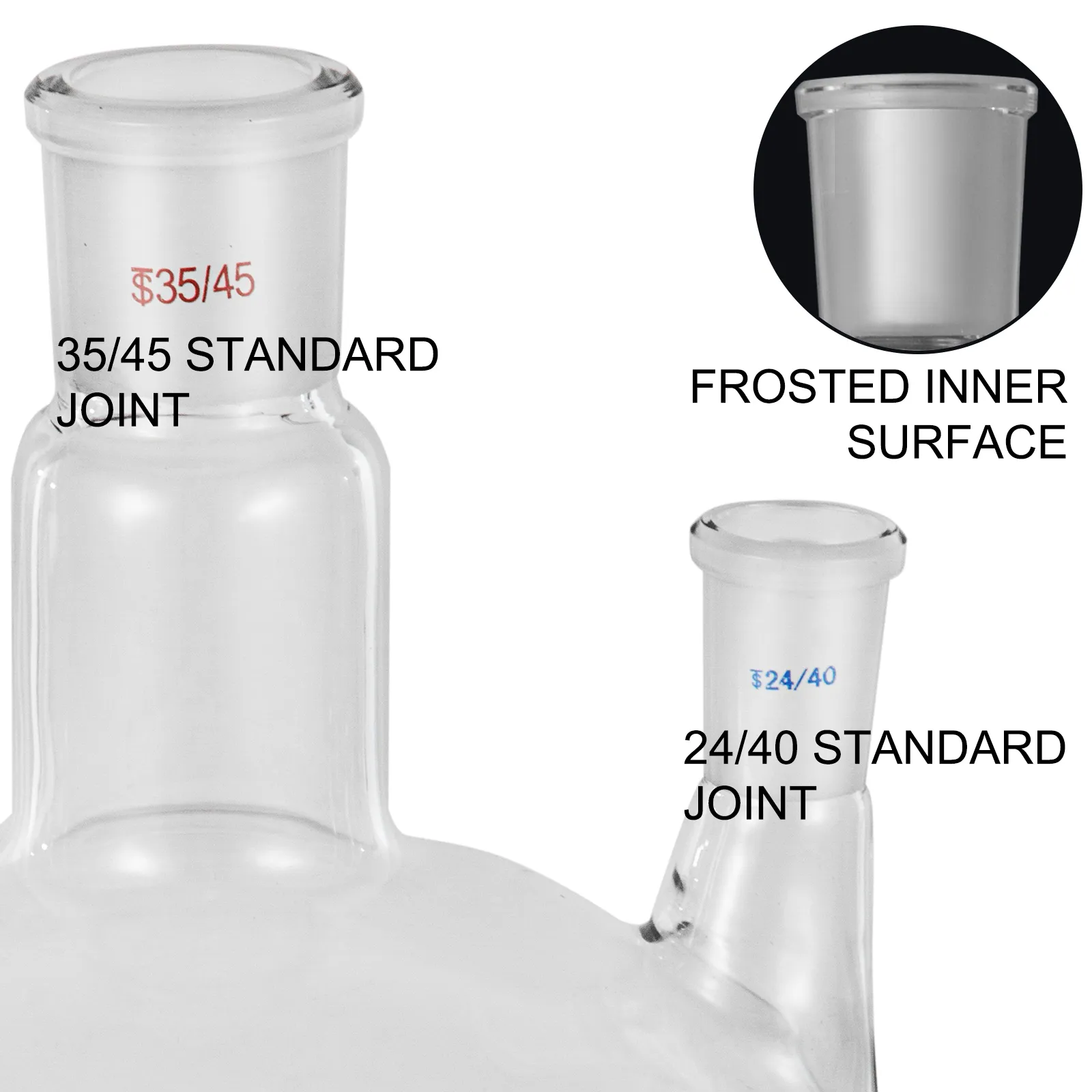 The flask is designed with 24/40 and 34/45 standard taper joints, providing excellent sealing performance for their frosted inner surface.
