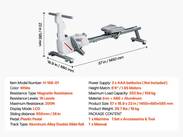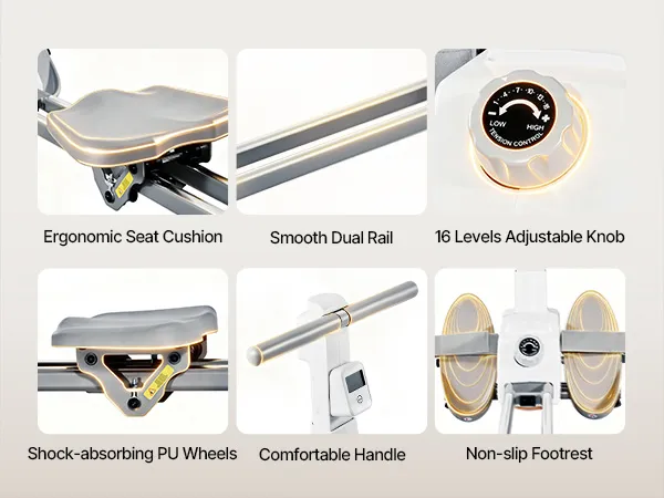 • Thoughtful Details, Comfy Rowing: The home gym rowing machine features dual-rail structure to ensures smooth, even rowing. Ergonomic seat and handles for max. comfort. HD LCD screen displays strokes, time, distance, and calories in real-time for workout tracking