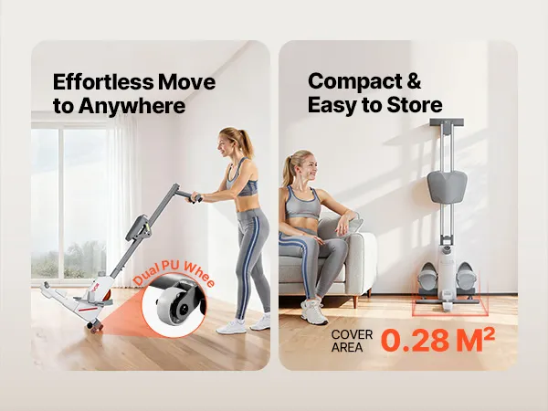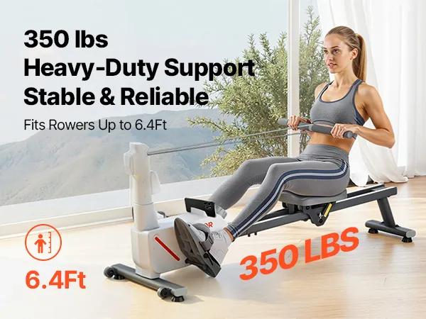 The rock-solid rowing machine supports up to 350 lbs capacity for all body types, ensuring stable and secure rowing. Smooth dual wheels for easy moving, plus vertical storage for space saving.