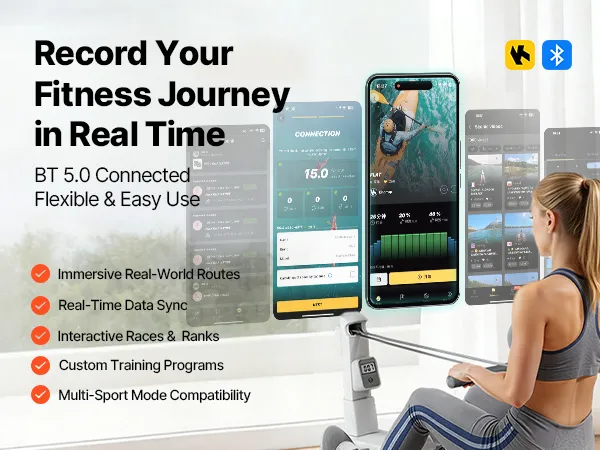 • BT 5.0 & Real-Time Tracking: The magnetic rowing machine supports Kinomap's via BT 5.0 connection, for immersive virtual training to stay motivated and daily track and save your workout history for seeing progress and stay motivated every session