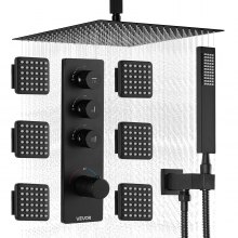 VEVOR dusjkransett, 406 mm termostatisk takmontert regndusjsystem med 6 kroppsdyser og håndholdt spray, roterbart regndusjhode med 3 funksjoner, komplett messingventil og pyntesett, matt svart