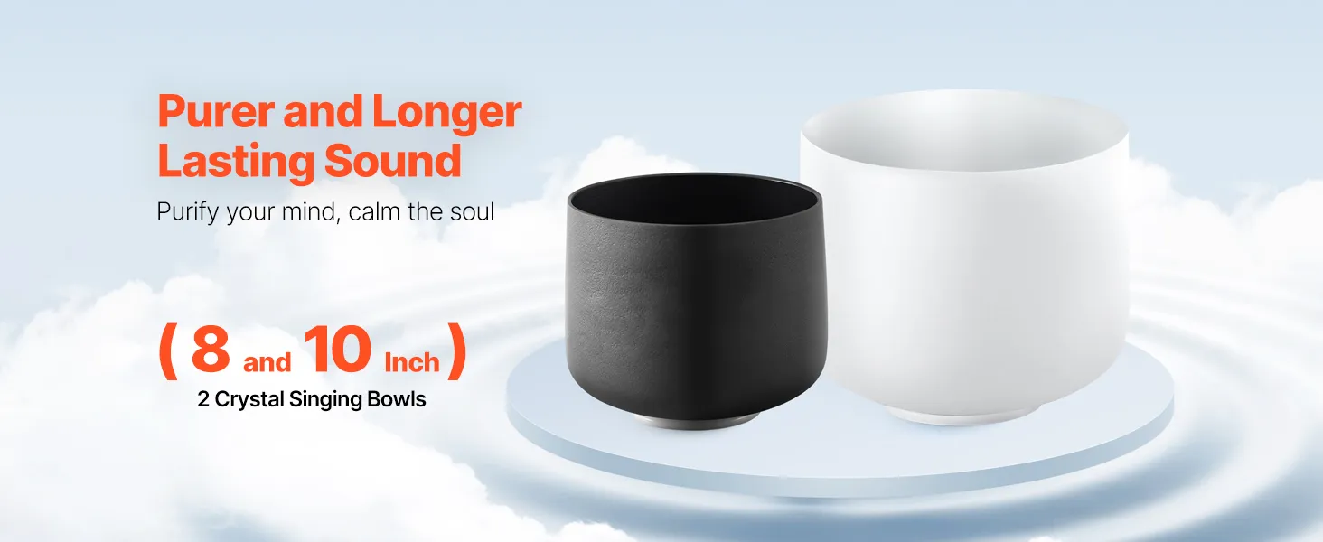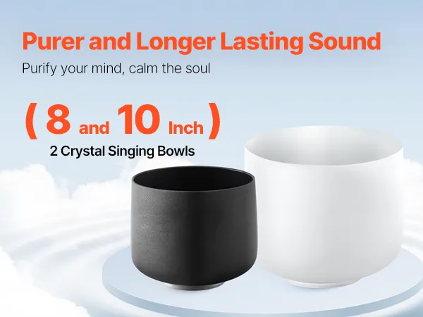 Găsește-ți pacea interioară: Bolurile cântătoare din cristal VEVOR de 20 cm și 25 cm rezonează cu nota La și nota Fa, stimulând și echilibrând chakra celui de-al treilea ochi și chakra inimii pentru a promova armonia corp-minte. Vibrațiile sonore pătrund în corp, rezonând cu celulele, țesuturile și organele interne, relaxând corpul și mintea prin terapia prin sunet.