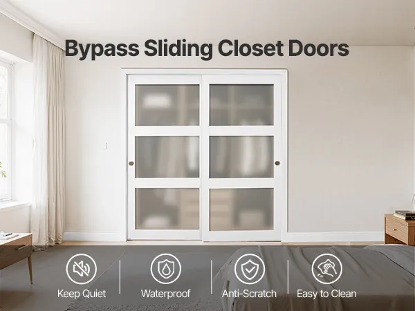 Stille og jævn glidning: Med 100.000+ rulletestede lejer, stålbeslag af høj kvalitet, holdbare dørskinner og ruller, robuste hængsler og gulvskinner, der forhindrer panelet i at svaje, giver vores dobbelte skydedøre til skab en stille og jævn glidning.