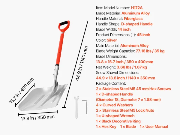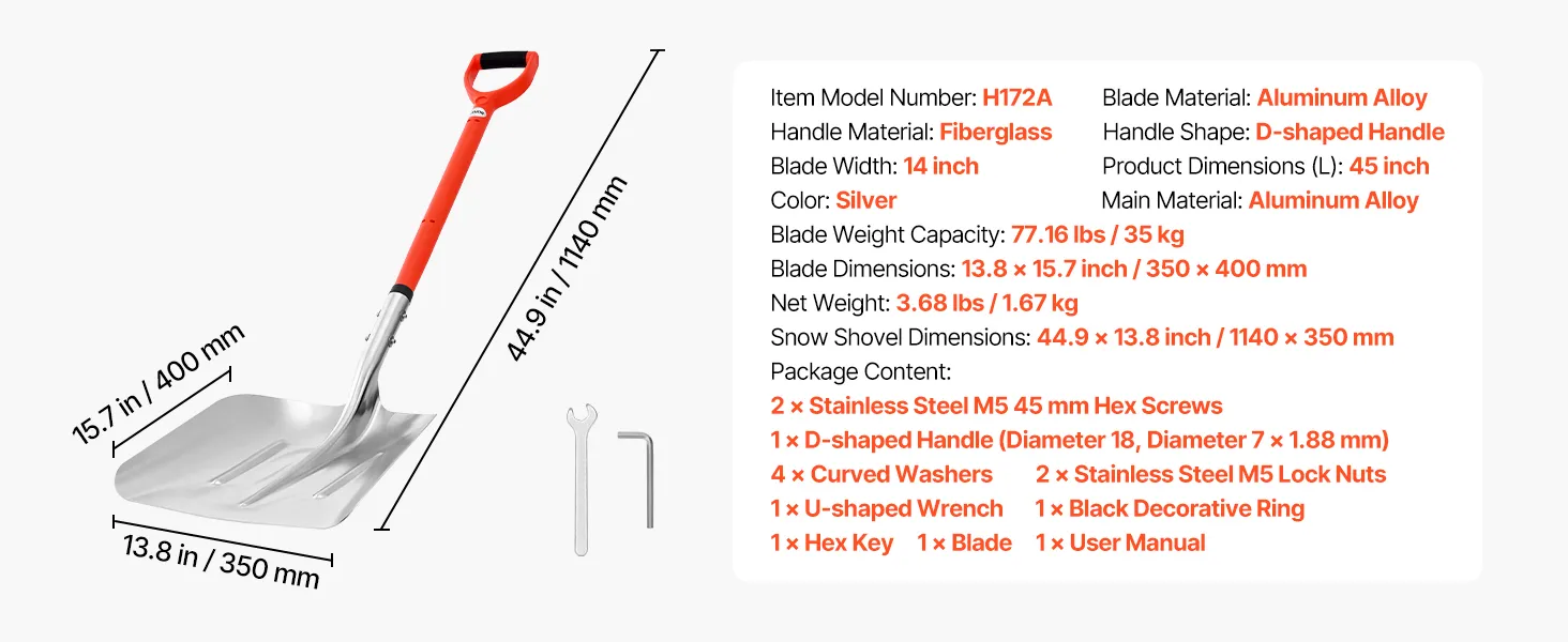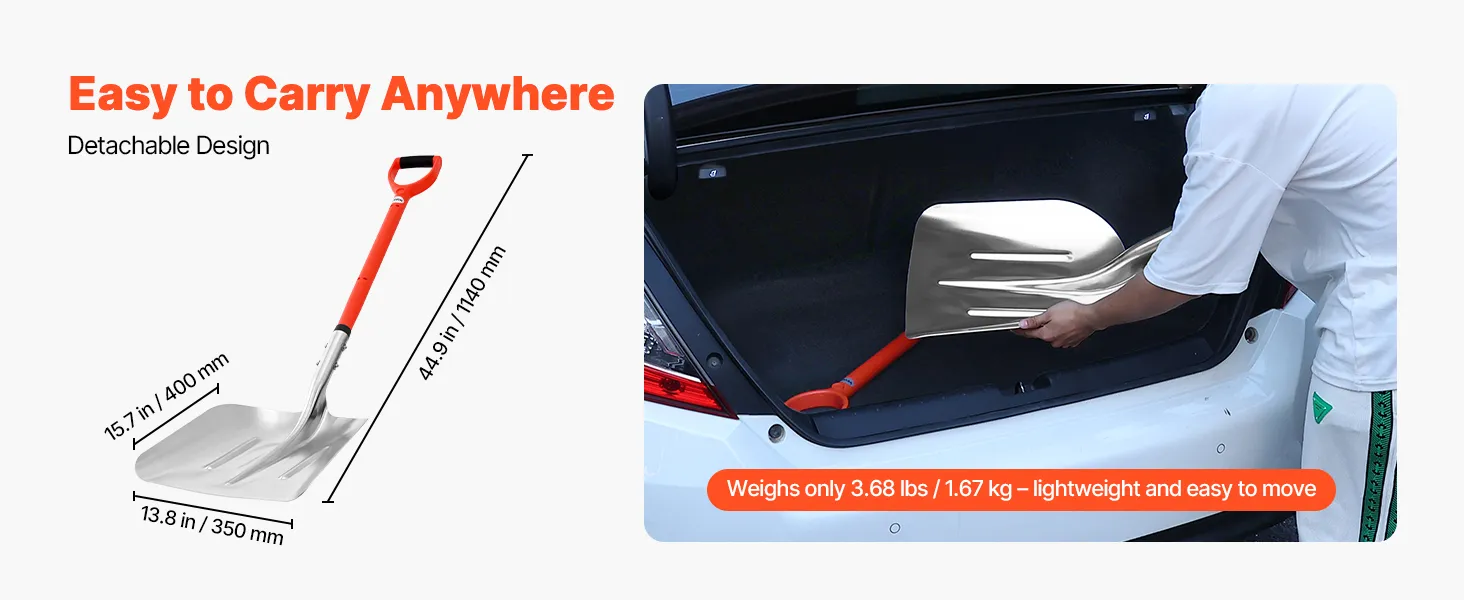 • Easy Assembly & Portable: The lightweight snow shovels come with a user manual, screws, and a hex key for quick setup without extra tools. Weighing only 3.68 lbs, it is lightweight and easy to carry. Ideal for camping, travel, and outdoor adventures