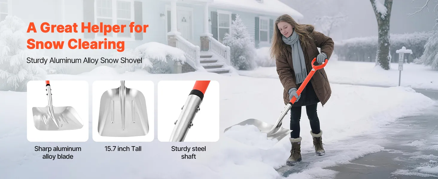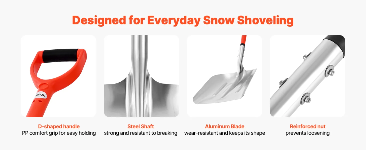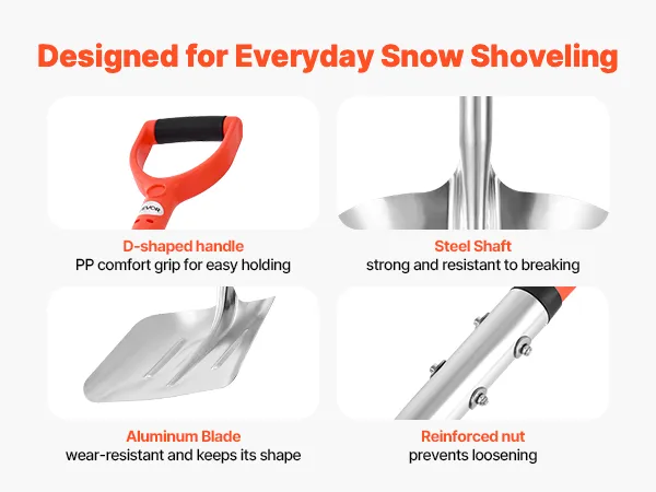 • Sturdy and Durable: The snow shovels have a high-toughness aluminum shovel head that resists frost, pressure, cracks, or deformation. The steel shaft is durable and stable to effectively handle dry or wet snow for long-term, and reliable use in snow