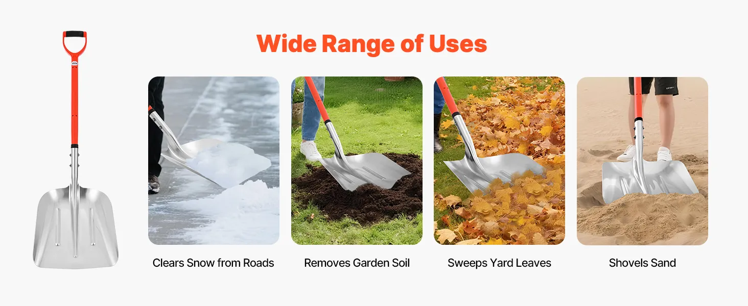 This snow shovels for seniors can be used to clean snow, clean up fallen leaves, do gardening work, and level sand or soil. Suitable for various household or outdoor scenarios. Whether for city commuting, suburban homes, or outdoor camps, it’s an essential multifunctional tool for year-round use.