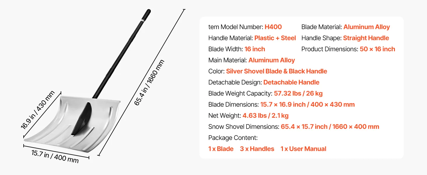 Efficient Snow Shoveling: This snow shovel for driveway features a 15.7 x 16.9 in sharp and widened aluminum blade to clear large areas of snow. Ideal for driveways and walkways, it reduces repeated effort and improves snow shovel efficiency