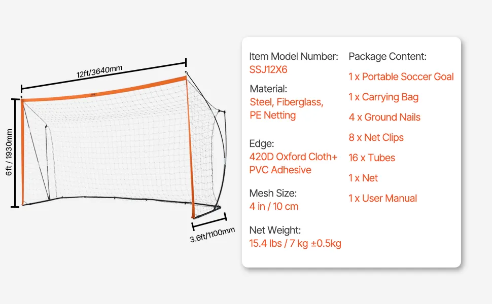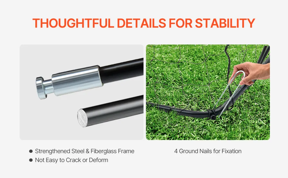 Steel & Fiberglass Structure: The soccer net features a solid 0.5-inch fiberglass frame combined with steel components for superior strength and stability. With the inclusion of six ground nails for secure fixation, there's no risk of the goal falling down during intense use.
