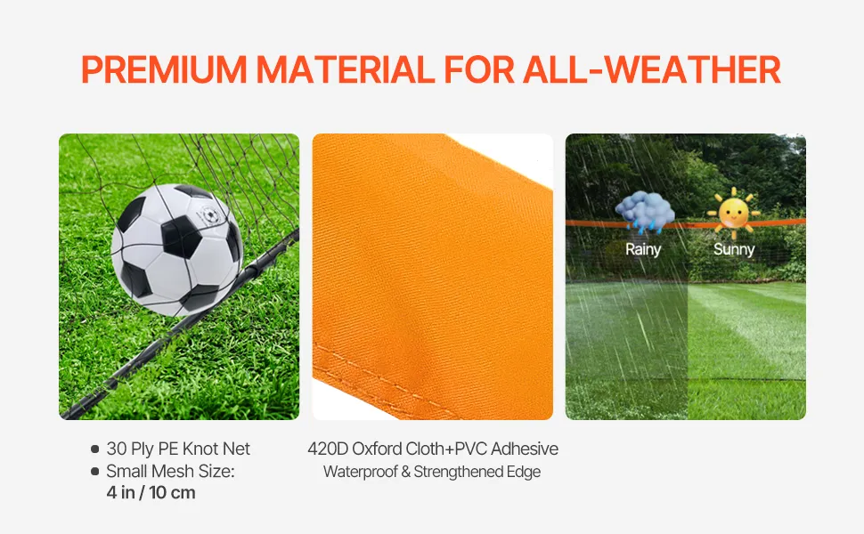 Premium Netting: Our soccer goal boasts premium PE netting with a robust 30-ply knot design. This weather-resistant netting is not only durable but also reinforced with 420D oxford cloth and PVC adhesive, making it waterproof and further strengthening its edges.