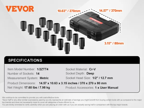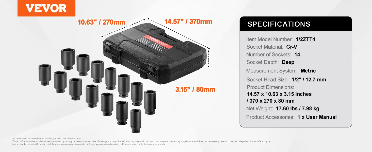 Conjunto de soquetes de impacto para porcas de eixo VEVOR, 1/2" de profundidade, 6+12 pontos, 14 peças