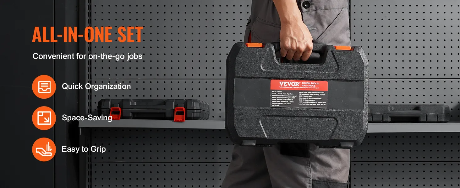 Estojo de armazenamento portátil: todos os soquetes de impacto são organizados em um estojo de armazenamento resistente para fácil acesso e transporte. O estojo é hermético para manter suas ferramentas secas e limpas, e inclui uma alça para facilitar o transporte.