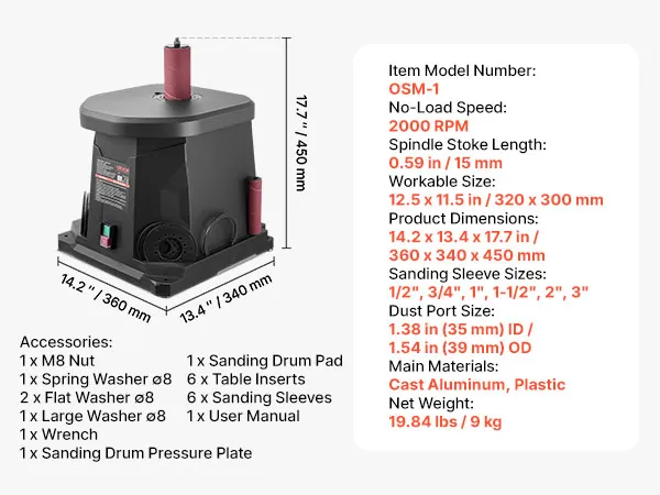 • Efficient Sanding: This oscillating spindle sander runs at 2000RPM high speed, delivering smooth, efficient sanding on flat, curved, and contoured surfaces. Ideal for furniture finishing, crafts sanding, and DIY woodworking projects