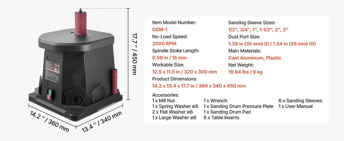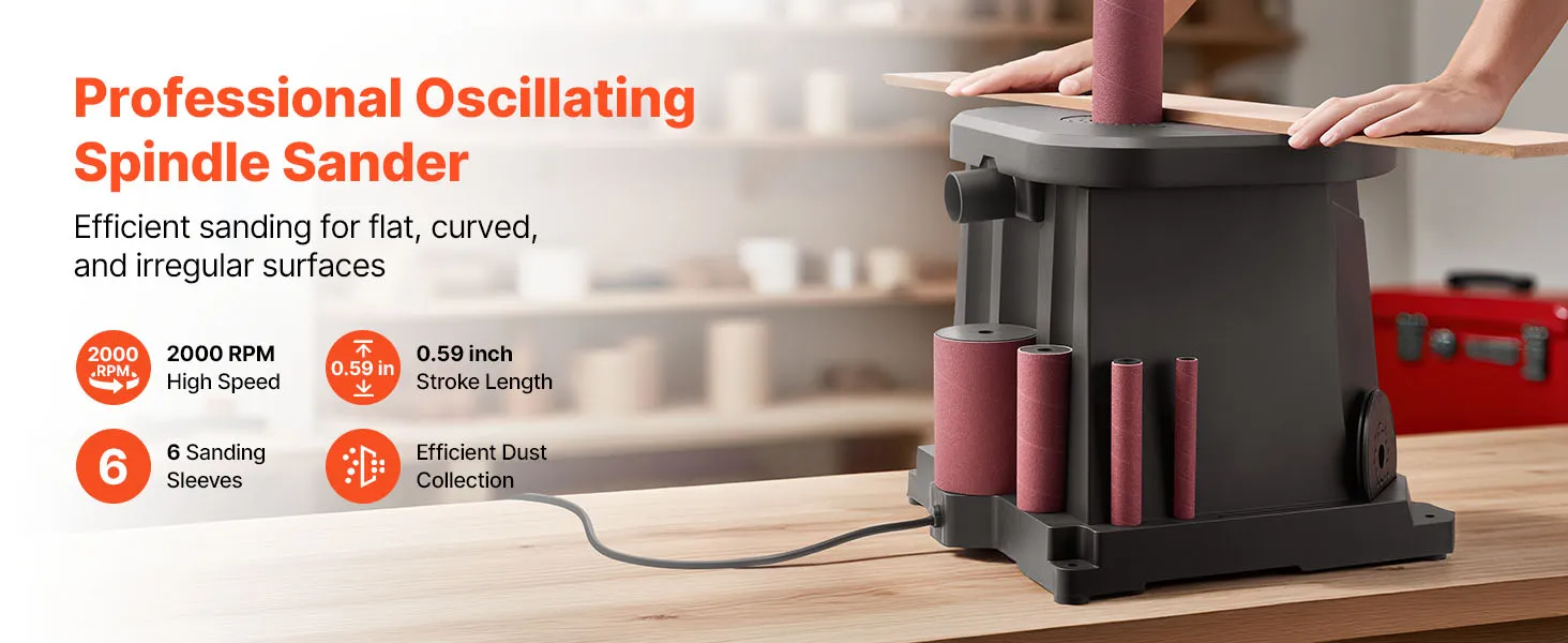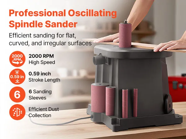 VEVOR Oscillating Spindle Sander, 2000RPM Benchtop Spindle Sander with 6 Sleeves (12.7–76.2 mm), 15 mm Stroke & Dust Connection Port for Furniture Finishing, Crafts Sanding, DIY Woodworking VEVOR Oscillating Spindle Sander, 2000RPM Benchtop Spindle Sander with 6 Sleeves (12.7–76.2 mm), 15 mm Stroke & Dust Connection Port for Furniture Finishing, Crafts Sanding, DIY Woodworking