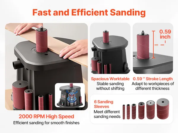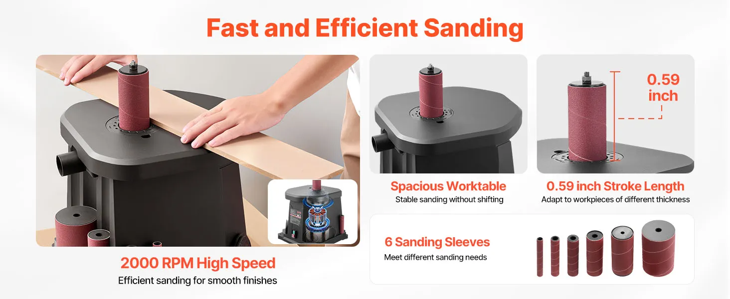 Whether for furniture sanding or DIY projects, this oscillating spindle sander delivers a smooth experience. With a 2000 RPM high speed, 6 sanding sleeves, a 15mm stroke length, and a wide cast aluminum worktable, it ensures more precise and efficient sanding for smooth finishes.