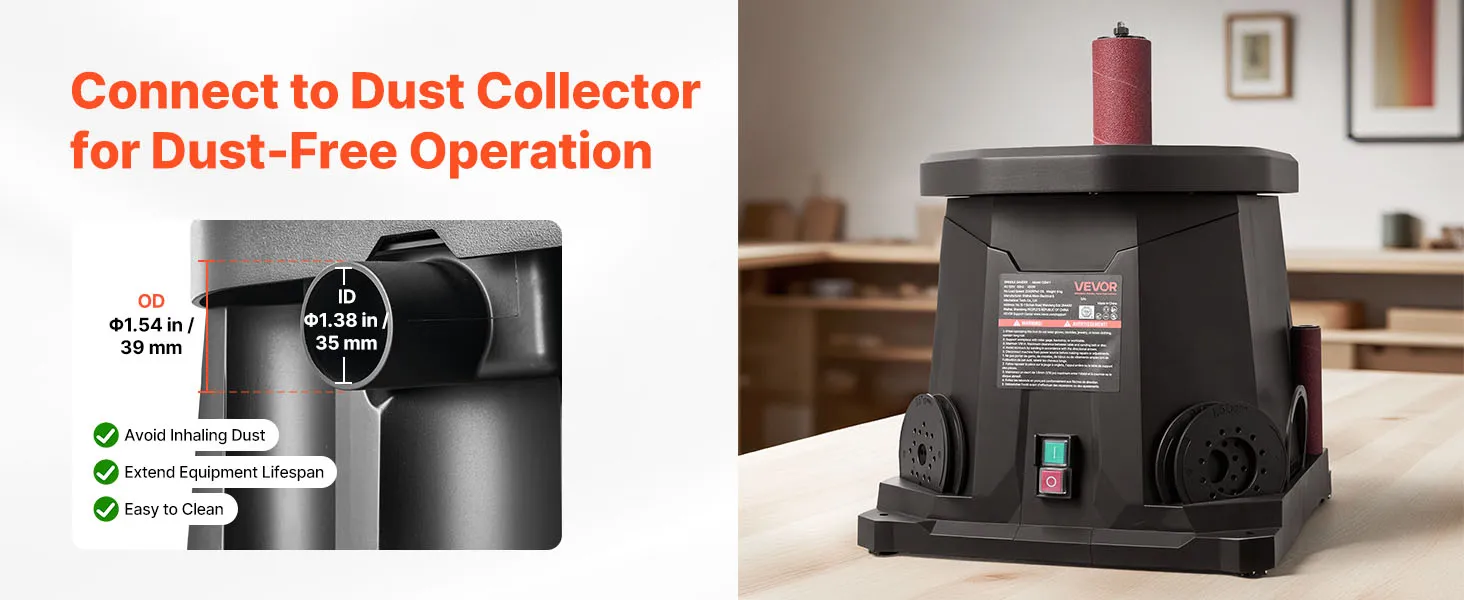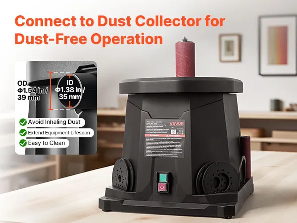 • Dust-Free Operation: Equipped with a 35mm ID and a 39mm OD dust port, our spindle sander connects easily to vacuum hoses for efficient dust collection, reducing cleanup and keeping your workspace cleaner