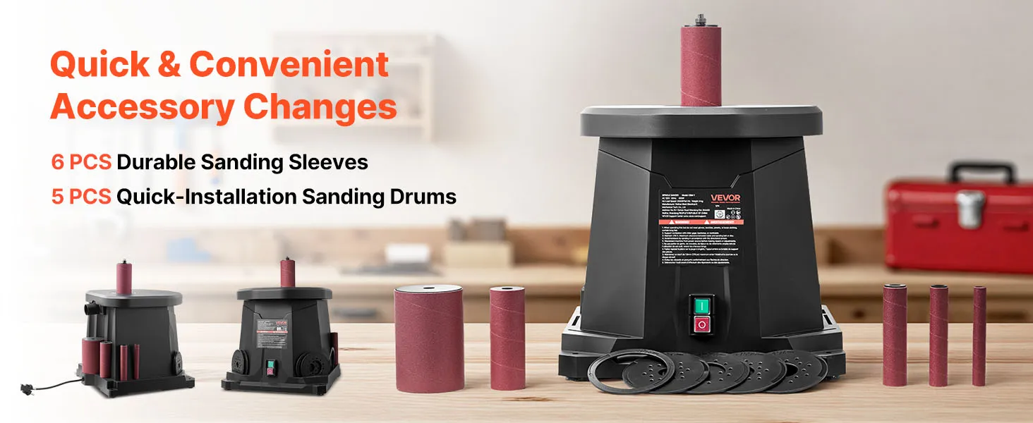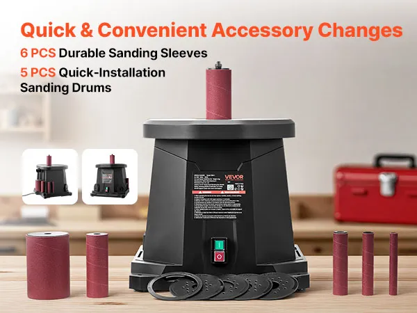 • 6 Sanding Sleeve Sizes: Equipped with 6 sanding sleeves (12.7 mm, 19mm, 25.4 mm, 38.1 mm, 50.8 mm, 76.2 mm) and 6 table inserts, suitable for different workpiece sizes and curves. Quick replacement makes sanding more flexible and efficient