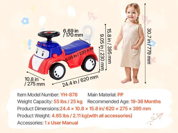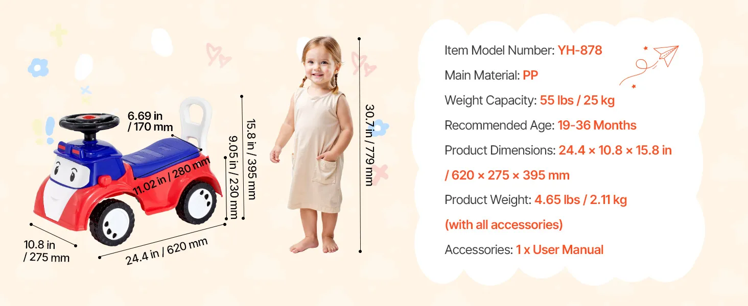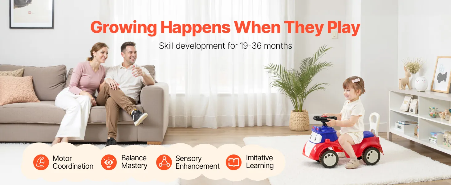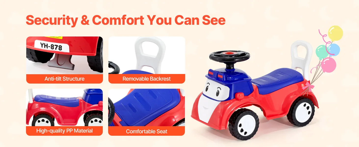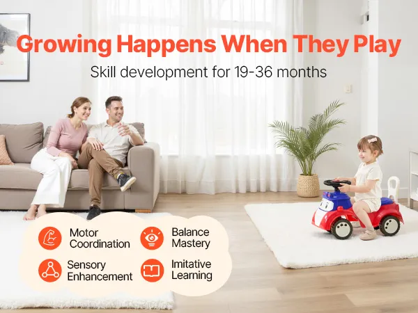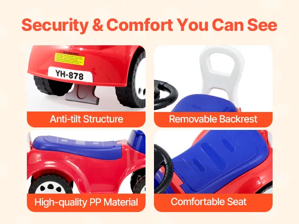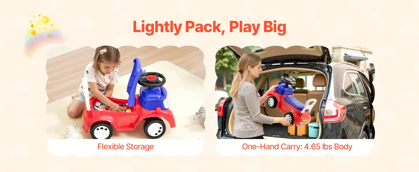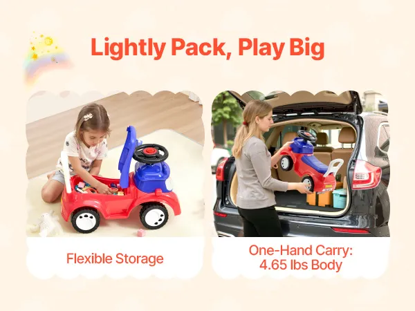 Convenient Storage: The hidden storage under the seat of the ride on toy holds essentials like snacks, diapers, and toys, teaching kids self-organization while meeting their needs during playtime or outings