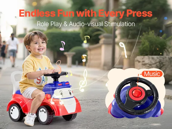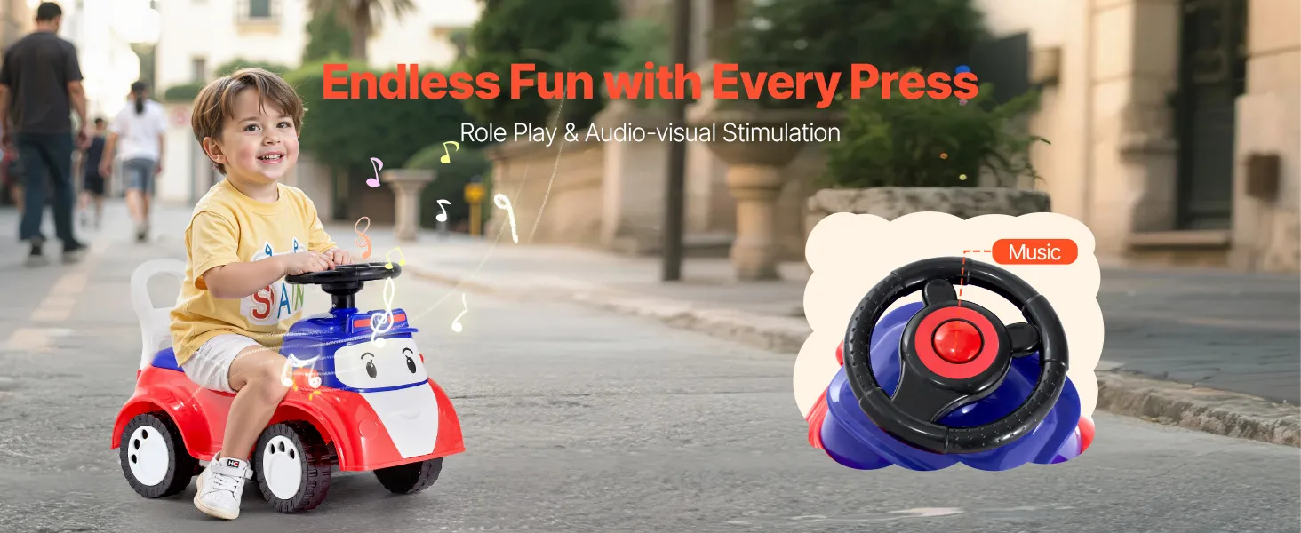 Fun Driving Experience: The steering wheel of the ride on push car features horn, music, phone, and engine sounds, sparking interest in role play and improving hand-eye coordination