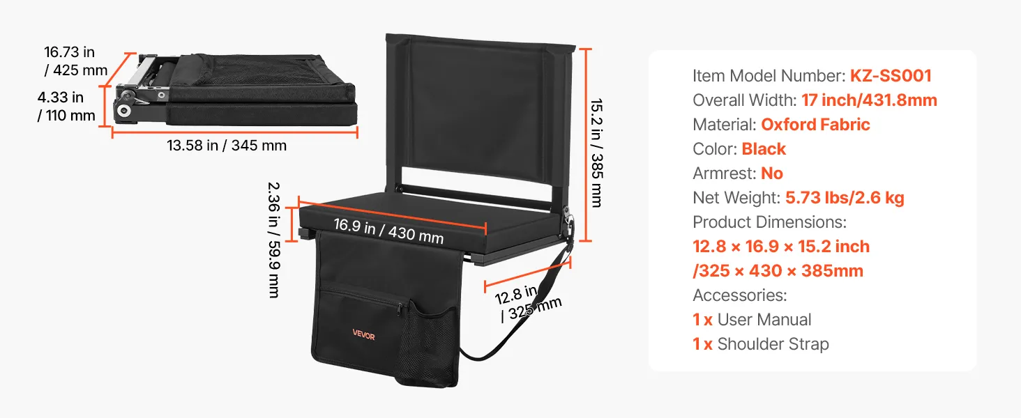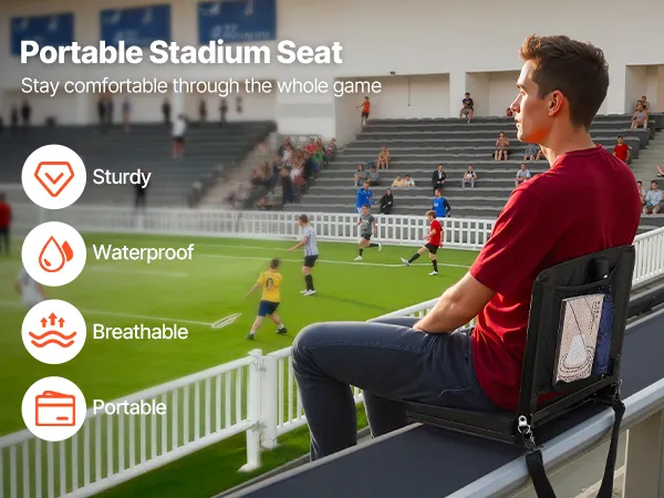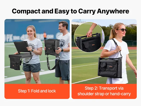 Lightweight & Foldable: This VEVOR bleacher seat features a foldable design that folds in one step and comes with a shoulder strap for easy carrying. Ideal for student athletes, parents, and sports spectators, it occupies minimal space and fits conveniently in a car trunk