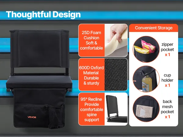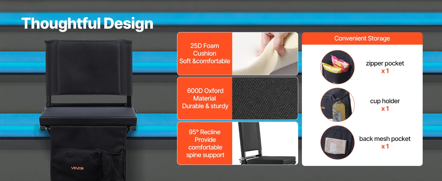This durable bleacher seat with back features multiple storage pockets, including a phone slot and rear pocket, to hold drinks, snacks, and tissues. Made from lightweight steel, high-density foam, and 600D waterproof Oxford cloth, it offers lasting comfort and practical use for outdoor events.