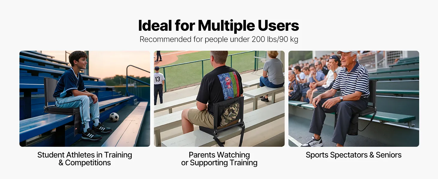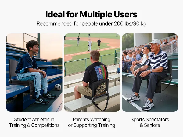 This foldable seat for bleacher is portable and reliable, ideal for student athletes during training, parents accompanying practices, and spectators of sports events or elderly users. Easy to carry and store, it provides comfortable seating at home or outdoor gatherings.