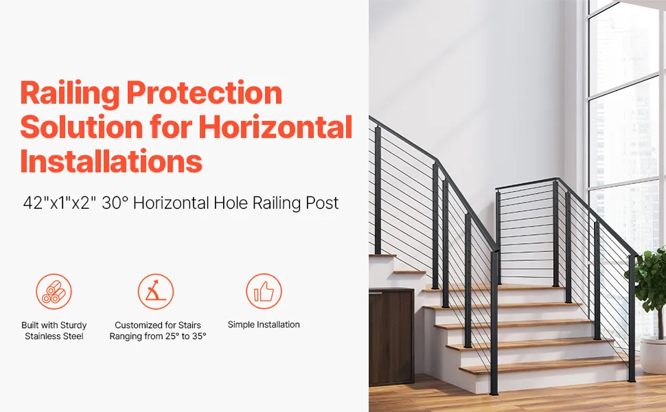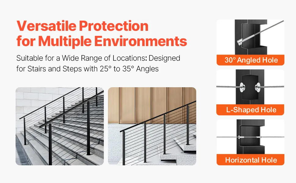 30° Hole Cable Railing Post: This 30° hole cable railing post is available in 43" and 36" heights, with hole sizes of 0.31" and 0.41", totaling 10-12 holes. It is designed for stair protection at angles from 25 to 35 degrees, ensuring safety for you and your family. Note: This product does not include wire ropes