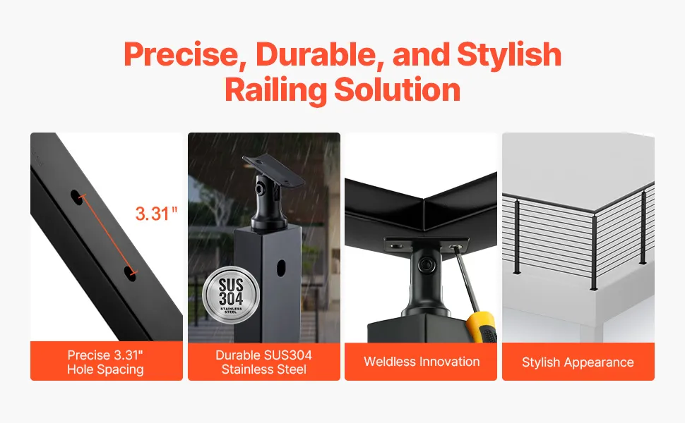Our cable railing system is made from high-quality SUS304 stainless steel, featuring 3" hole spacing that complies with building codes. It is non-welded with a black finish, making it stylish and versatile for various settings.
