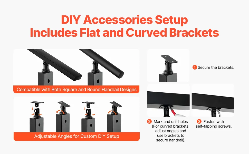 Easy Installation and DIY: This deck railing post includes horizontal and curved supports, suitable for various hole types in railing posts. It is compatible with square and round pipe handrails, allowing for DIY customization of handrail angles