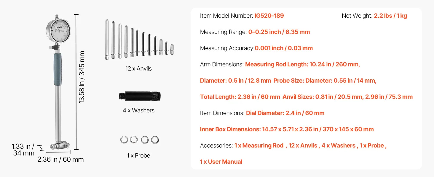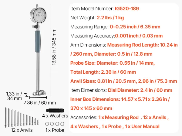 VEVOR Dial Test Indicator and Bore Gauge Measuring Tool Set, Dial Indicator 0.03 mm Accuracy, 50.8-152.4 mm Bore Range with Rod, Storage Case, Anvils for Industrial Machining Measurements