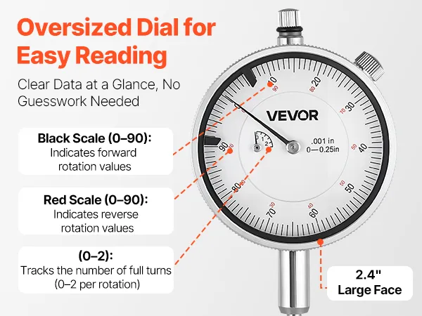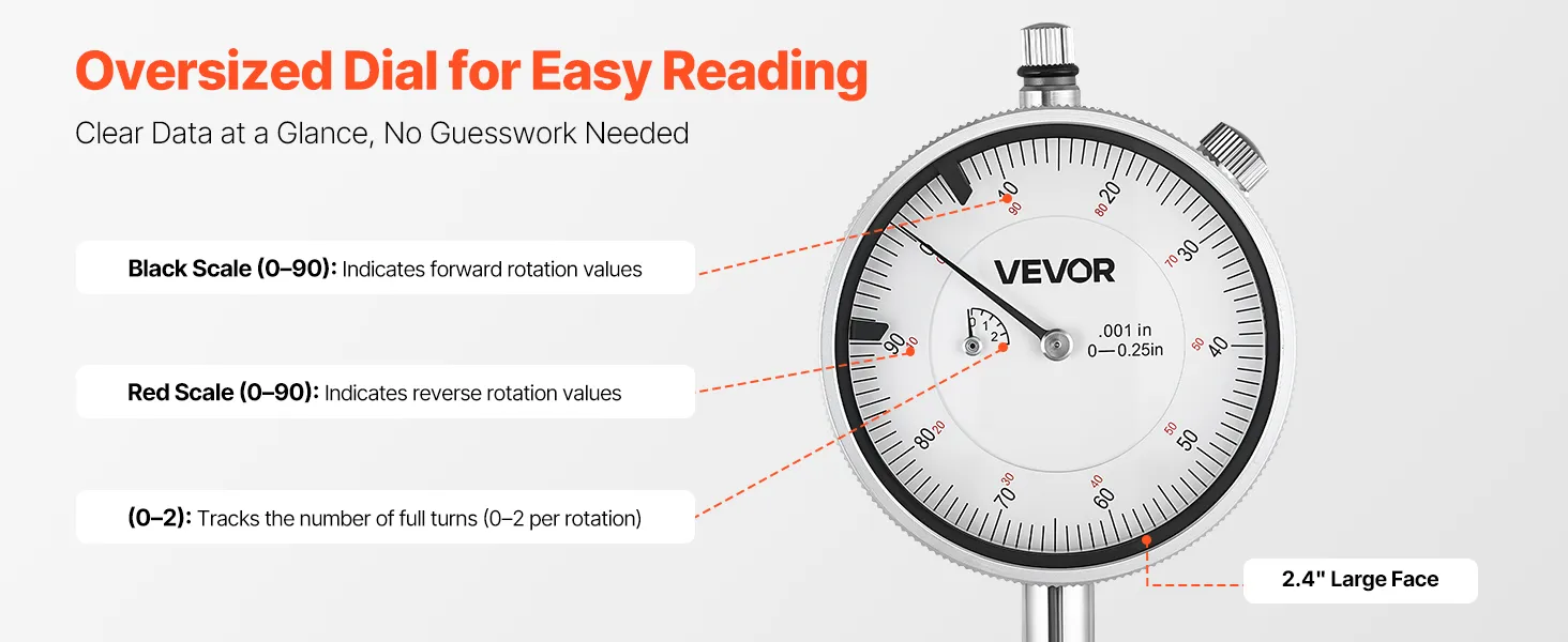 Clear Readings: A 2.4 inch oversized dial with high-contrast black and white design keeps dial indicators easy to read, even in low light or while wearing gloves. Fine graduations meet the clarity needed for frequent precision tasks