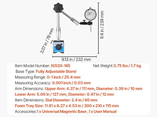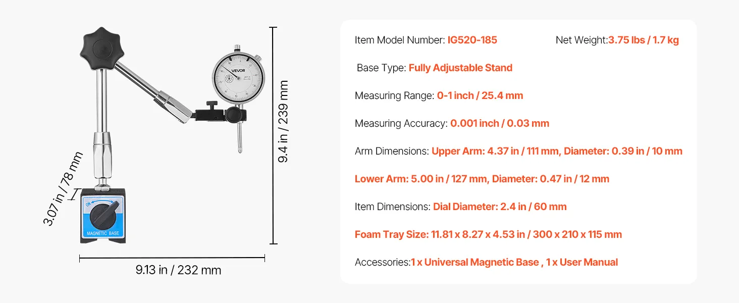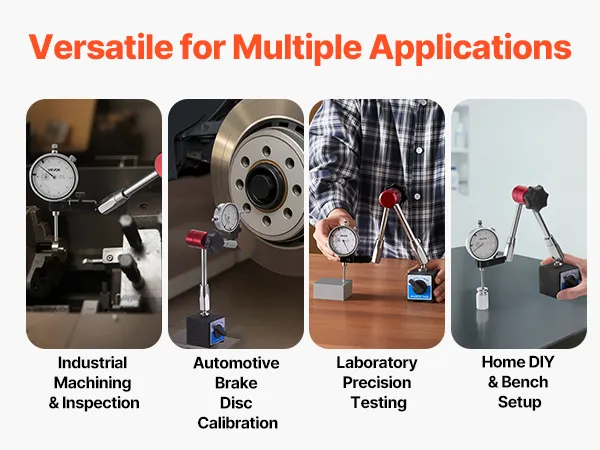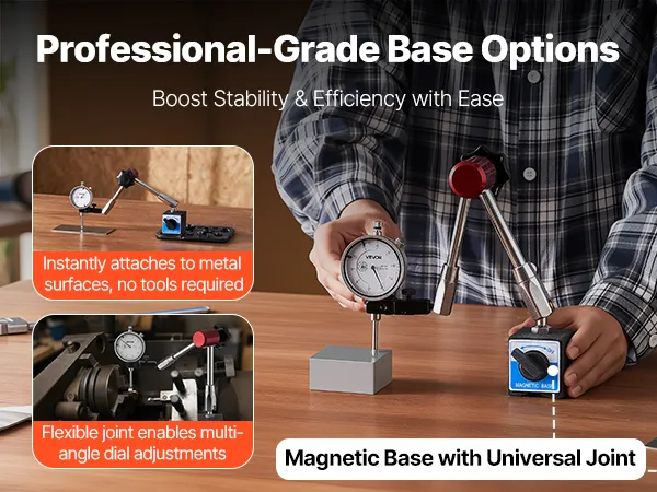 Adjustable Angles: The magnetic base attaches firmly to lathes, milling machines, and other metal surfaces without tools. A universal joint structure enables the dial indicator to rotate across multiple angles and heights for precise measurement