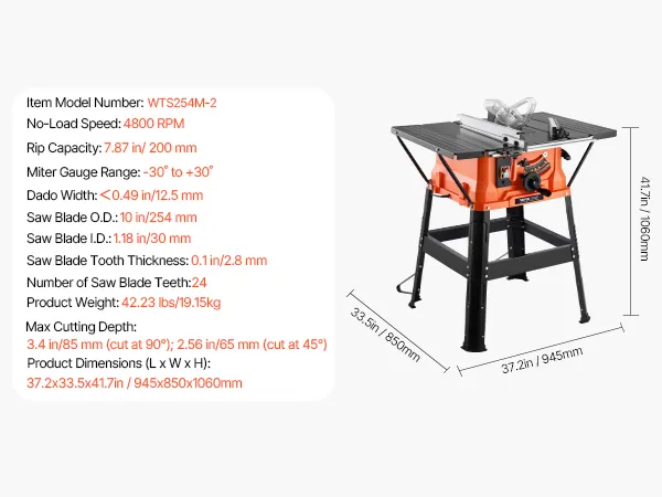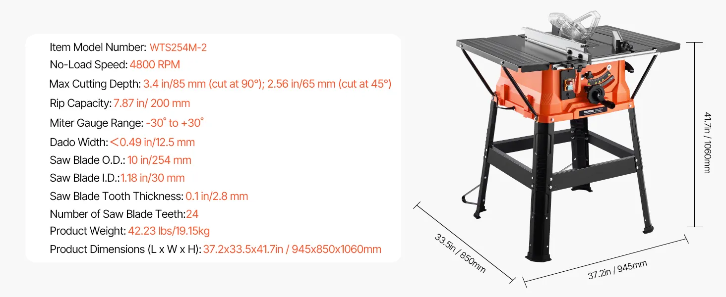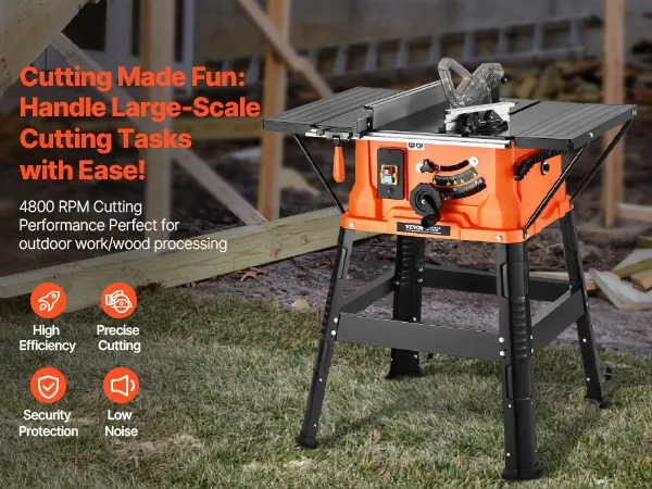 Stolová píla VEVOR so stojanom, 254 mm, prenosná kompaktná stolová píla s výkonom 1800 W, maximálna pozdĺžna kapacita 200 mm, rýchlosť rezania 4800 ot./min., s 24-zubovým pílovým kotúčom, posuvný pokosový doraz, na obrábanie dreva a výrobu nábytku.