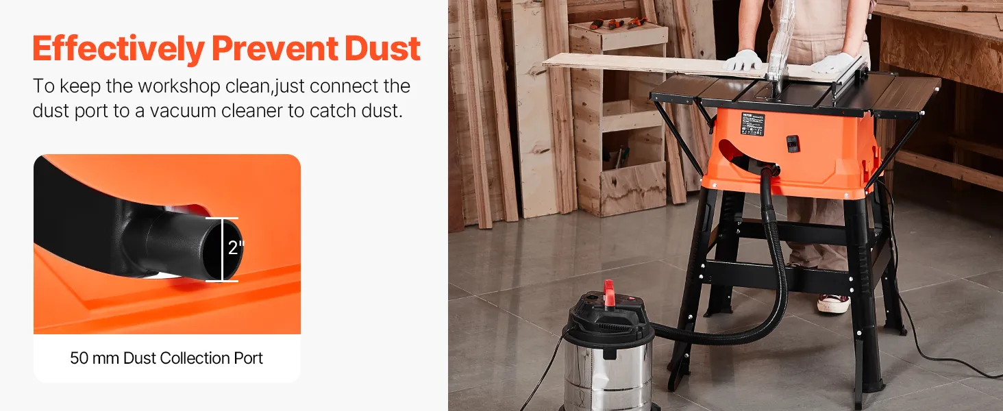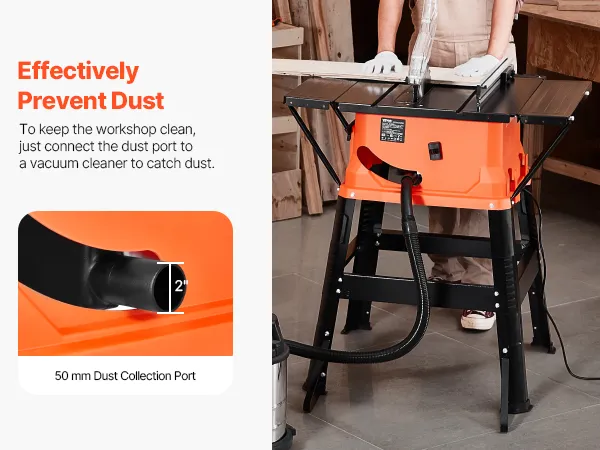 Naša stolová píla na stavenisko je navrhnutá s 50 mm odsávacím otvorom a uľahčuje udržiavanie čistého pracovného prostredia. Jednoducho pripojte odsávací otvor k vysávaču a píla bude počas práce efektívne zachytávať prach a nečistoty.