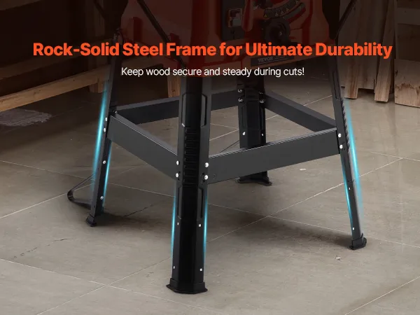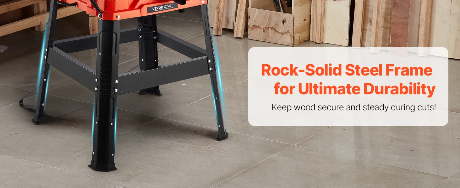 Robustný kovový rám: Táto stolová píla je navrhnutá s celokovovým rámom a poskytuje pevnú a stabilnú nosnú konštrukciu, ideálnu pre dlhodobé úlohy. Vylepšené vystužené oceľové rúry na oboch koncoch stolovej píly zvyšujú jej odolnosť a stabilitu, čo vám umožňuje ľahko zvládať náročné práce s drevom.